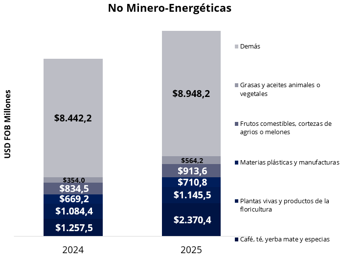 Entre los principales productos no minero-energéticos exportados en este periodo se encuentran los relacionados con los demás cafés sin tostar, sin descafeinar (USD FOB $2.683,1 millones), seguido por las demás flores y capullos frescos, cortados para ramos o adornos (USD FOB $712,6 millones) y Bananas o plátanos tipo «cavendish valery» frescos con USD FOB $618,6 millones.