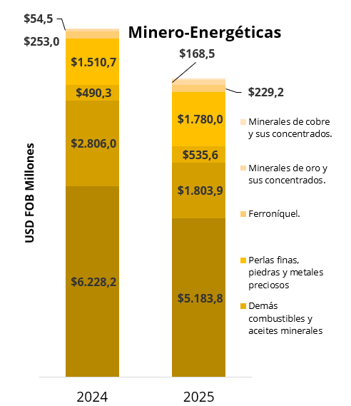 La canasta de exportación no minero-energética año corrido presentó un incremento de 14,4% contra el mismo periodo de 2024, con un total exportado de USD FOB $14.625,7 millones. Por su parte, las exportaciones minero-energéticas decrecieron 14,4%, dinámica que se explica en principal medida por la caída de las exportaciones de las Hullas térmicas (-35,7%), aceites crudos de petróleo (-16,8%) y ferroníquel (-9,4%).