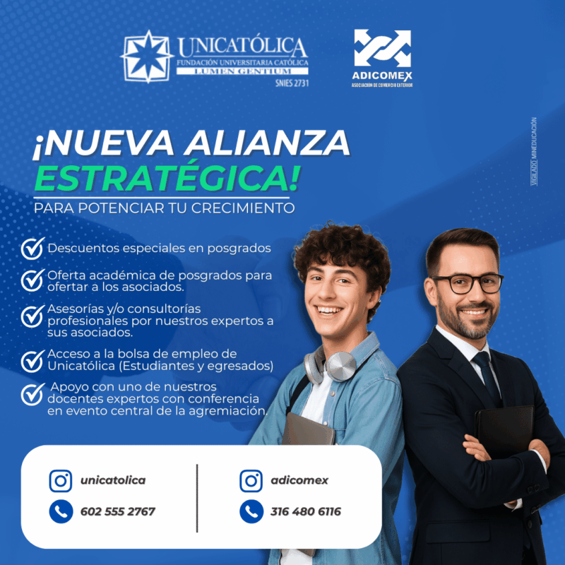 Por ser parte de Adicomex, ahora disfrutas de beneficios exclusivos gracias a nuestra nueva alianza con la Fundación Universitaria Católica Lumen Gentium – Unicatólica. Esta colaboración está diseñada para impulsar tu crecimiento profesional y académico a través de oportunidades formativas y servicios especializados. Beneficios Exclusivos para Asociados ADICOME Accede de manera preferencial a: Estos beneficios