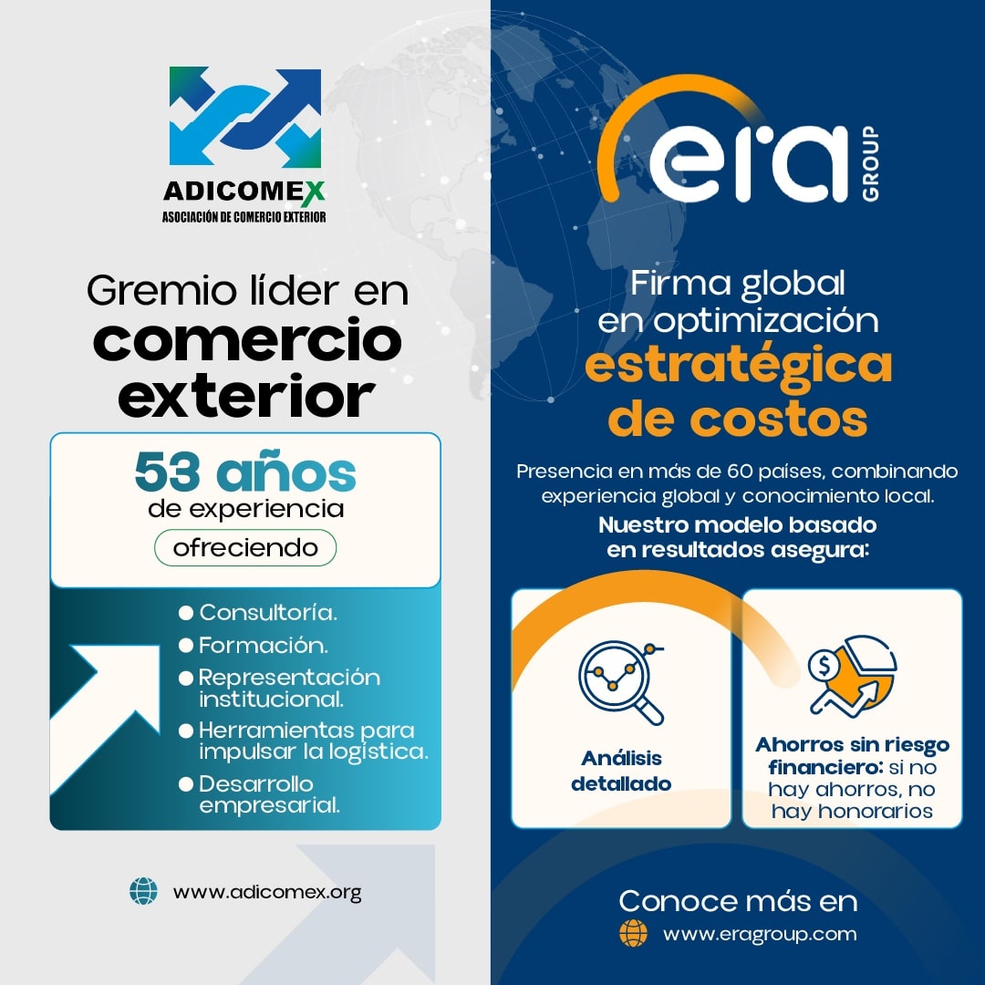 Estimados, En la Asociación de Comercio Exterior – Adicomex, continuamos fortaleciendo alianzas que aporten valor real a la gestión empresarial de nuestros afiliados. Nos complace anunciar nuestra alianza con ERA Group, firma internacional con presencia en más de 60 países y experta en optimización estratégica de costos. Gracias a esta colaboración, nuestros afiliados podrán acceder