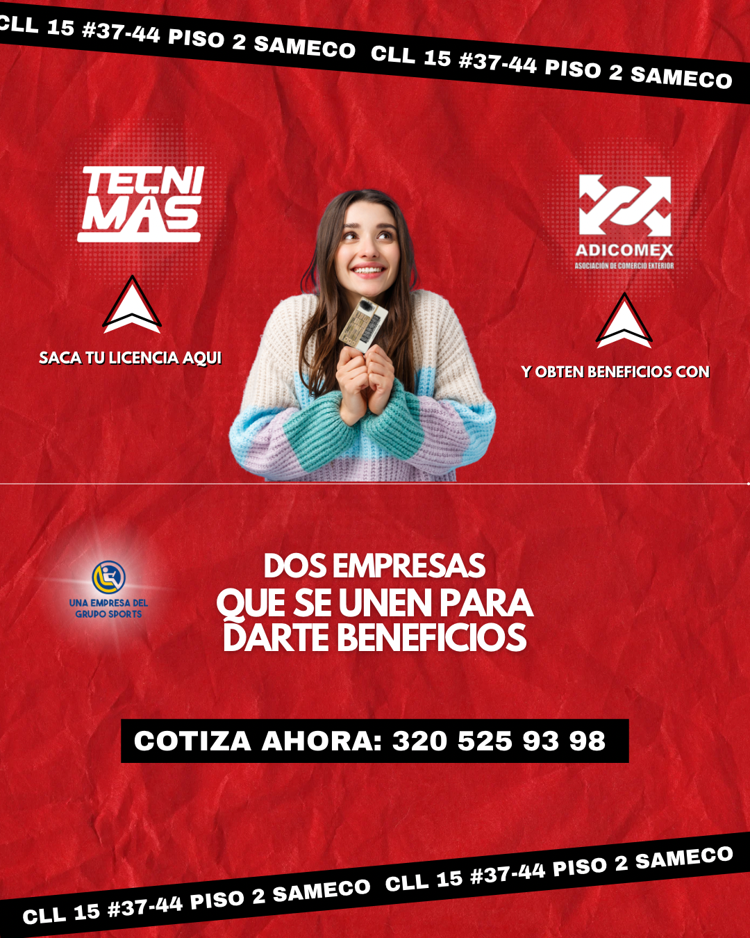 Estimados, En la Asociación de Comercio Exterior – Adicomex seguimos fortaleciendo nuestras alianzas para brindar beneficios reales a nuestros afiliados. Nos complace presentar nuestra alianza con Tecnimas, una empresa del Grupo Sports especializada en procesos de formación y trámite de licencias de conducción. Gracias a esta unión, nuestros afiliados, sus colaboradores y familiares podrán acceder