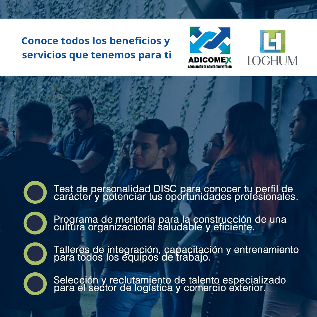 Estimados, En la Asociación de Comercio Exterior – Adicomex, continuamos fortaleciendo nuestra red de alianzas estratégicas para ofrecer beneficios exclusivos que impulsen el crecimiento de nuestros afiliados. Nos complace presentarle nuestra alianza con LOGHUM, una firma especializada en desarrollo humano, formación de equipos, liderazgo y talento para los sectores de logística y comercio exterior. A