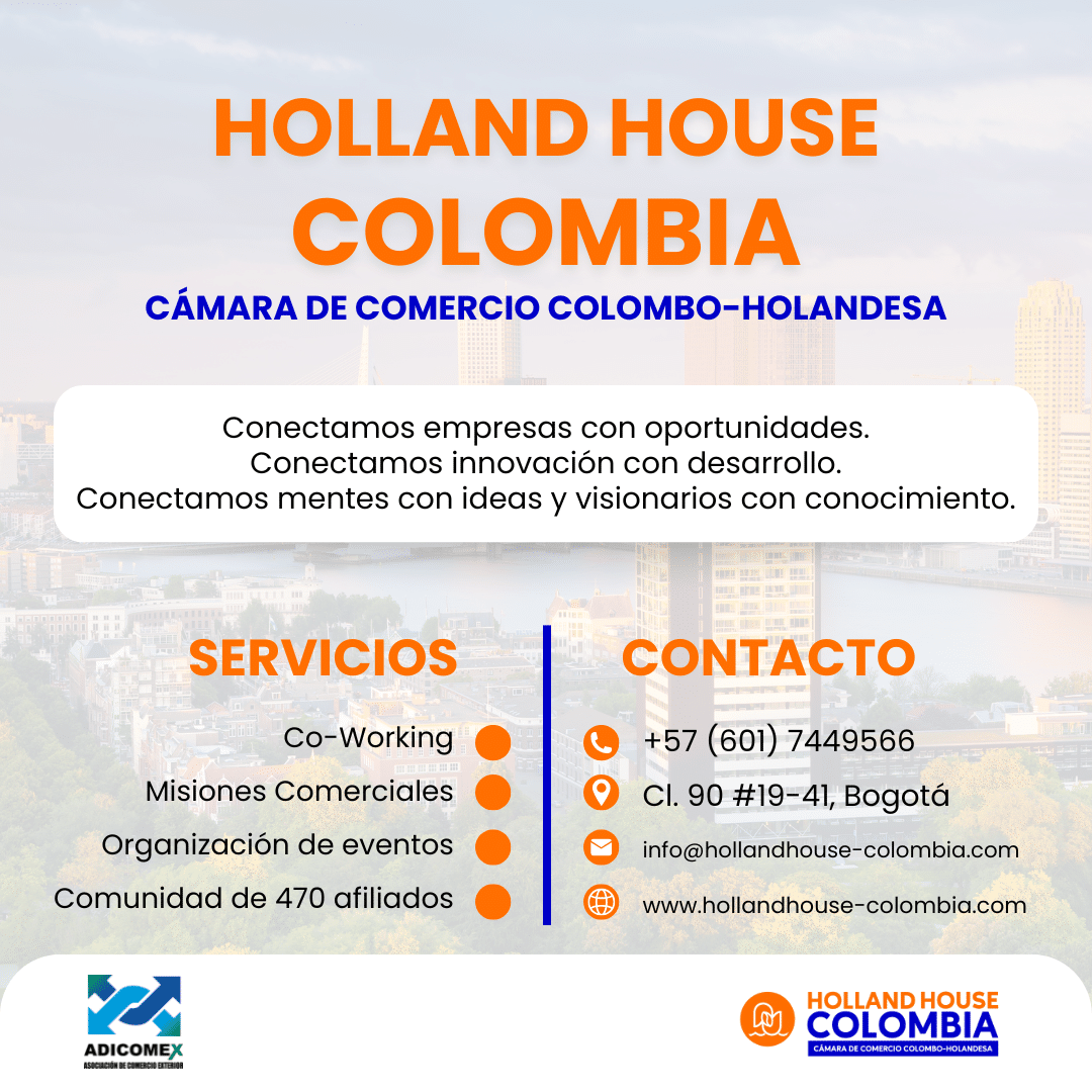 Por ser parte de Adicomex, ahora accedes a beneficios exclusivos gracias a nuestra alianza con Holland House Colombia, una organización que conecta empresas, innovación y conocimiento para impulsar el desarrollo empresarial entre Colombia y los Países Bajos. A través de esta alianza, podrás participar en misiones comerciales, acceder a espacios de co–working, asistir a eventos