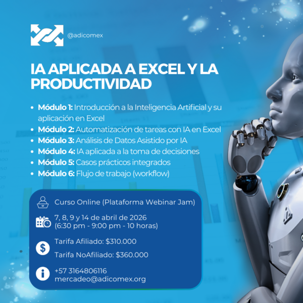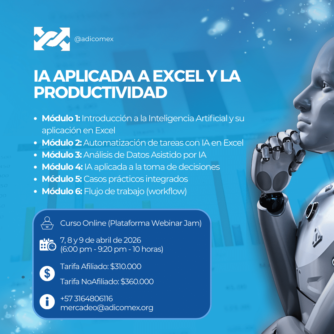 Aprende a integrar Inteligencia Artificial con Excel para automatizar procesos, analizar datos con mayor rapidez y mejorar la toma de decisiones en tu trabajo. Un curso práctico orientado a aumentar la productividad y eficiencia profesional.