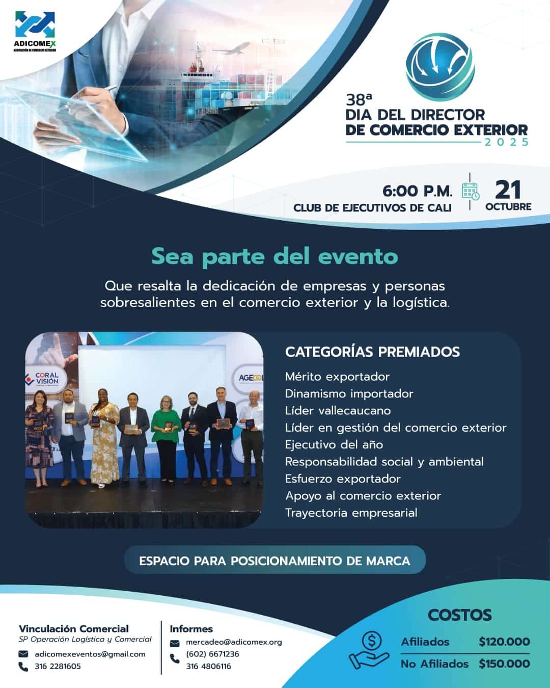 Estimados empresarios, La Asociación de Comercio Exterior – Adicomex los invita a participar en los premios “XXXVIII Día del Director del Comercio Exterior 2025”, evento que se realizará el día martes 21 de Octubre en formato presencial, en el Club de Ejecutivos de la Ciudad de Cali. Durante 53 años la Asociación de Comercio Exterior,